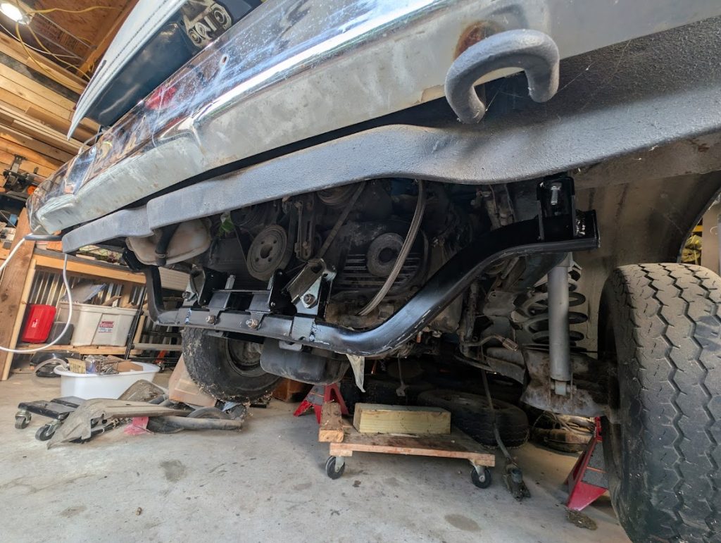 The kit consists of three pieces that bolt into the where the previous Subaru motor mounts were. Those four bolts holding the two Subaru mounts on took a lot of persuasion to come off. The dipstick also had to be removed in this process, which will not be removed in the build.